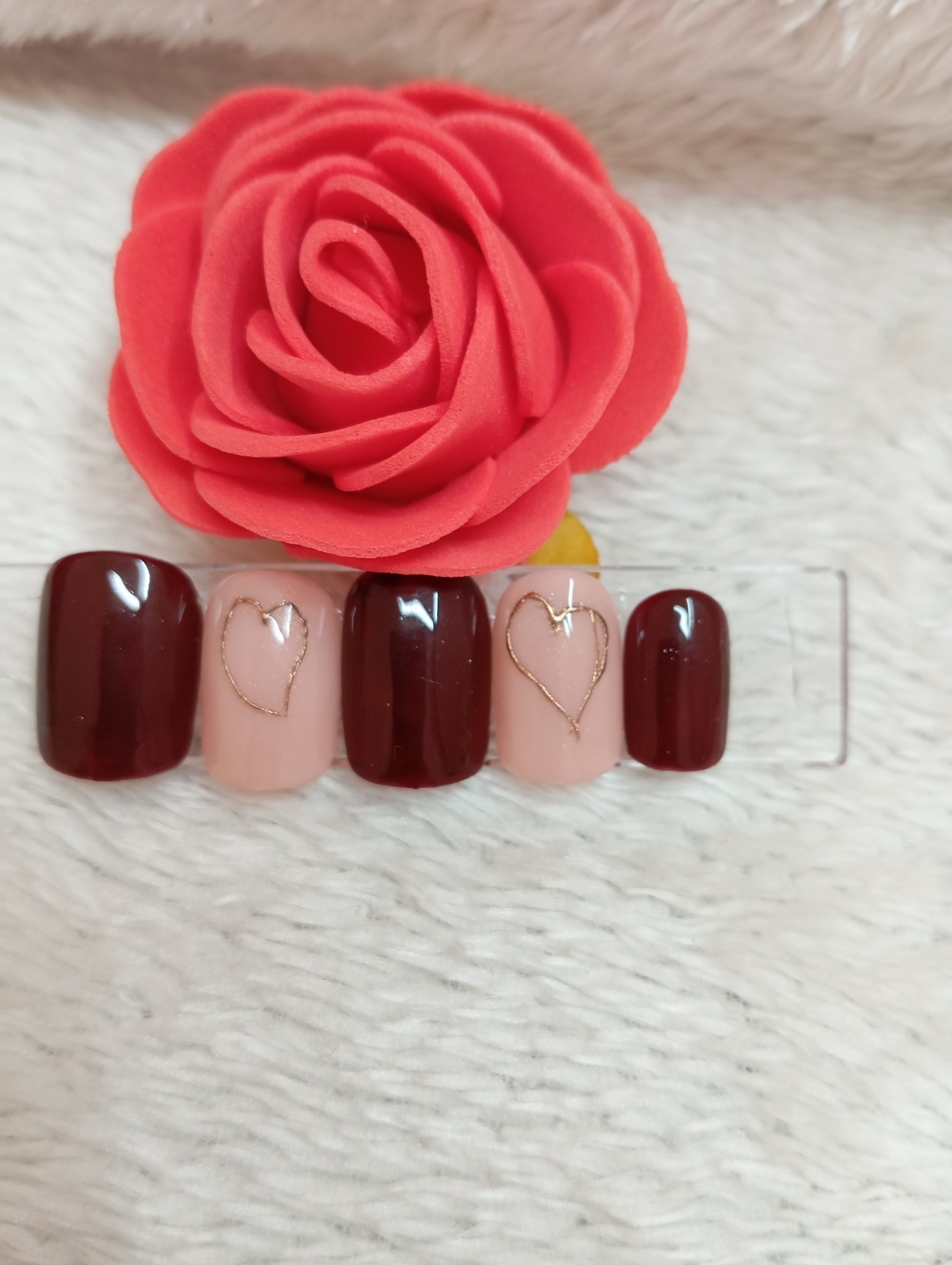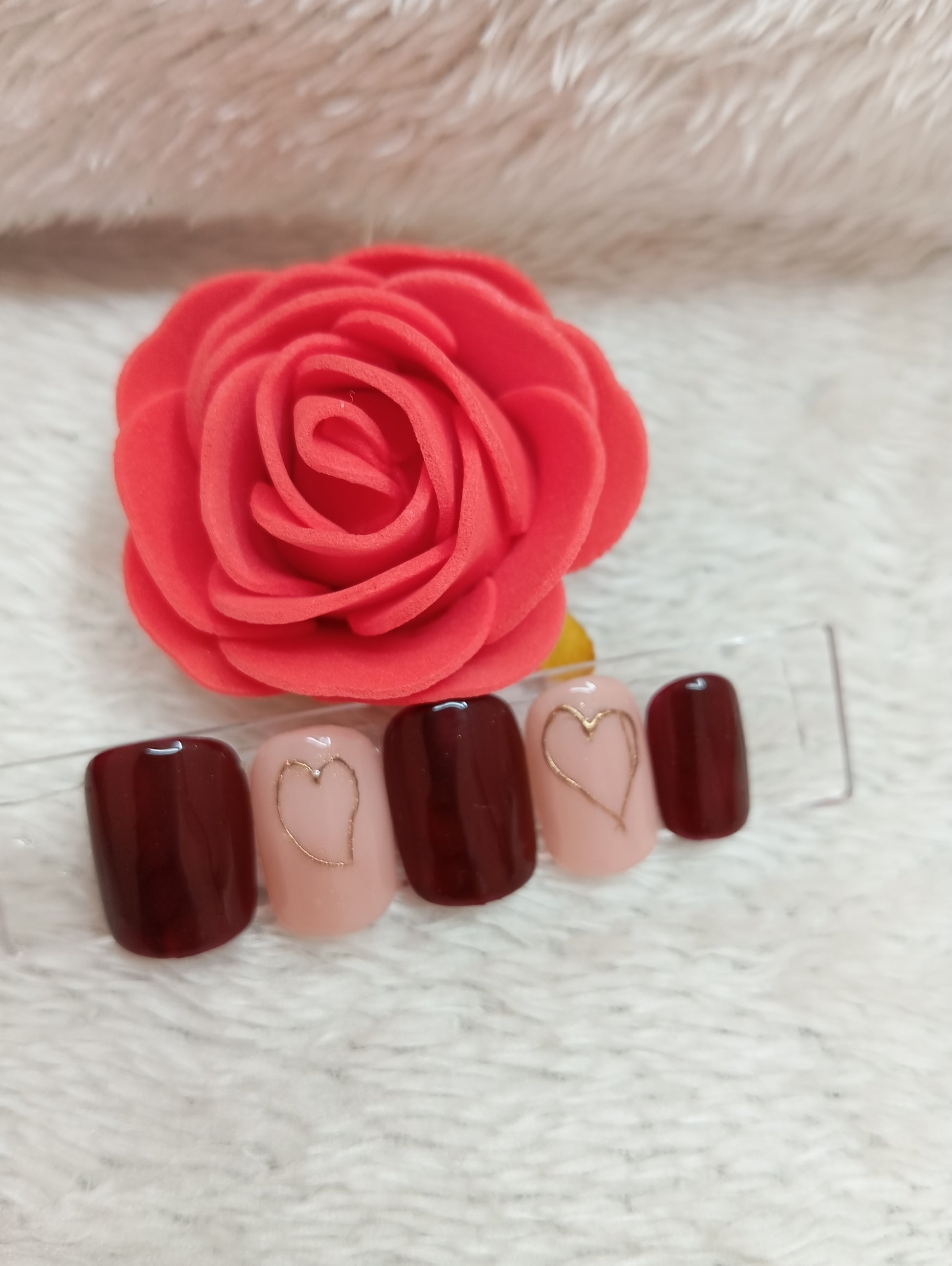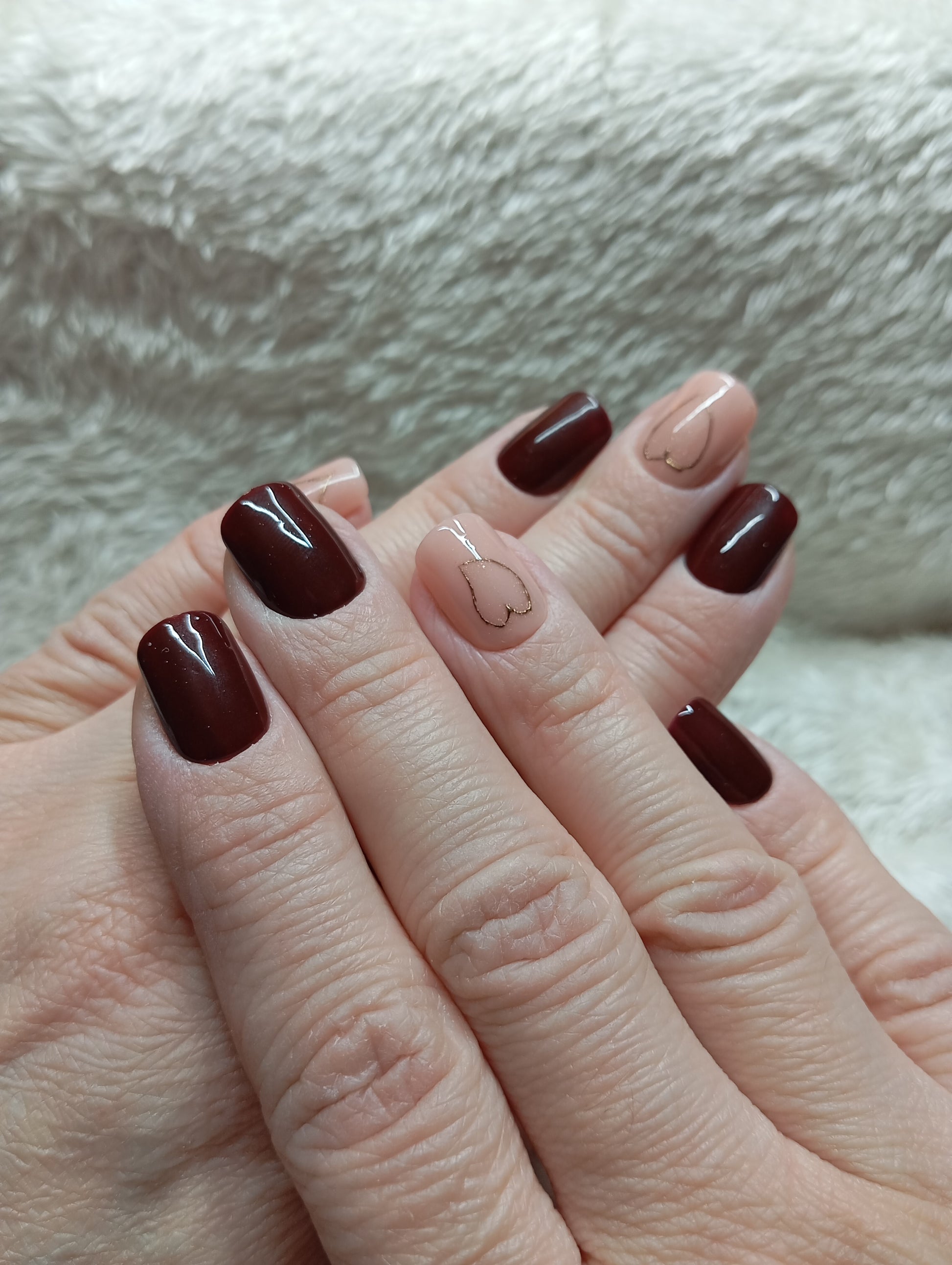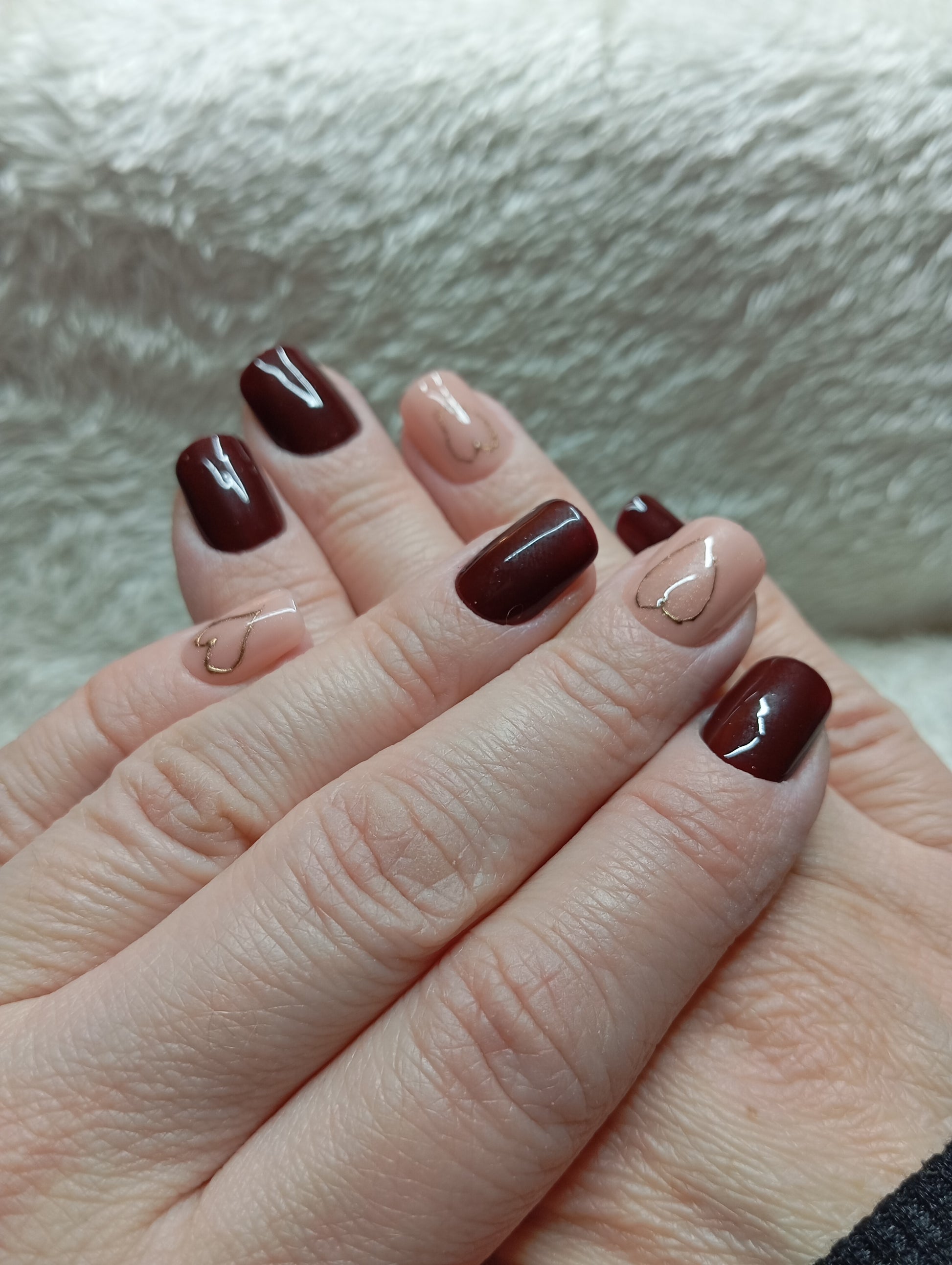 🖌️ Technique : Bordeaux brillant + nude crème + cœurs dorés
