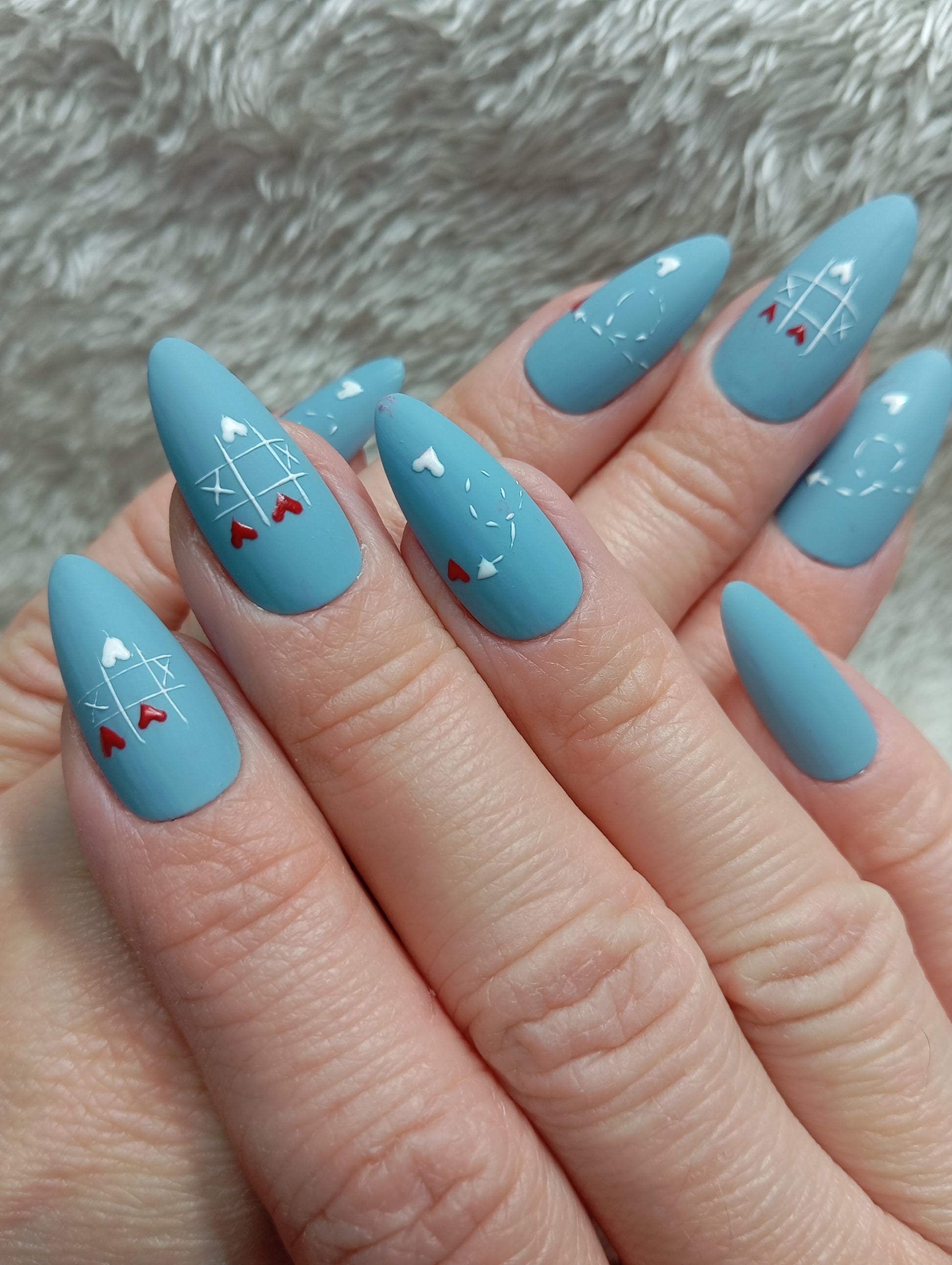 • Finition : Mat velouté (bleu) + nail art peint détaillé (enveloppes + cœurs)