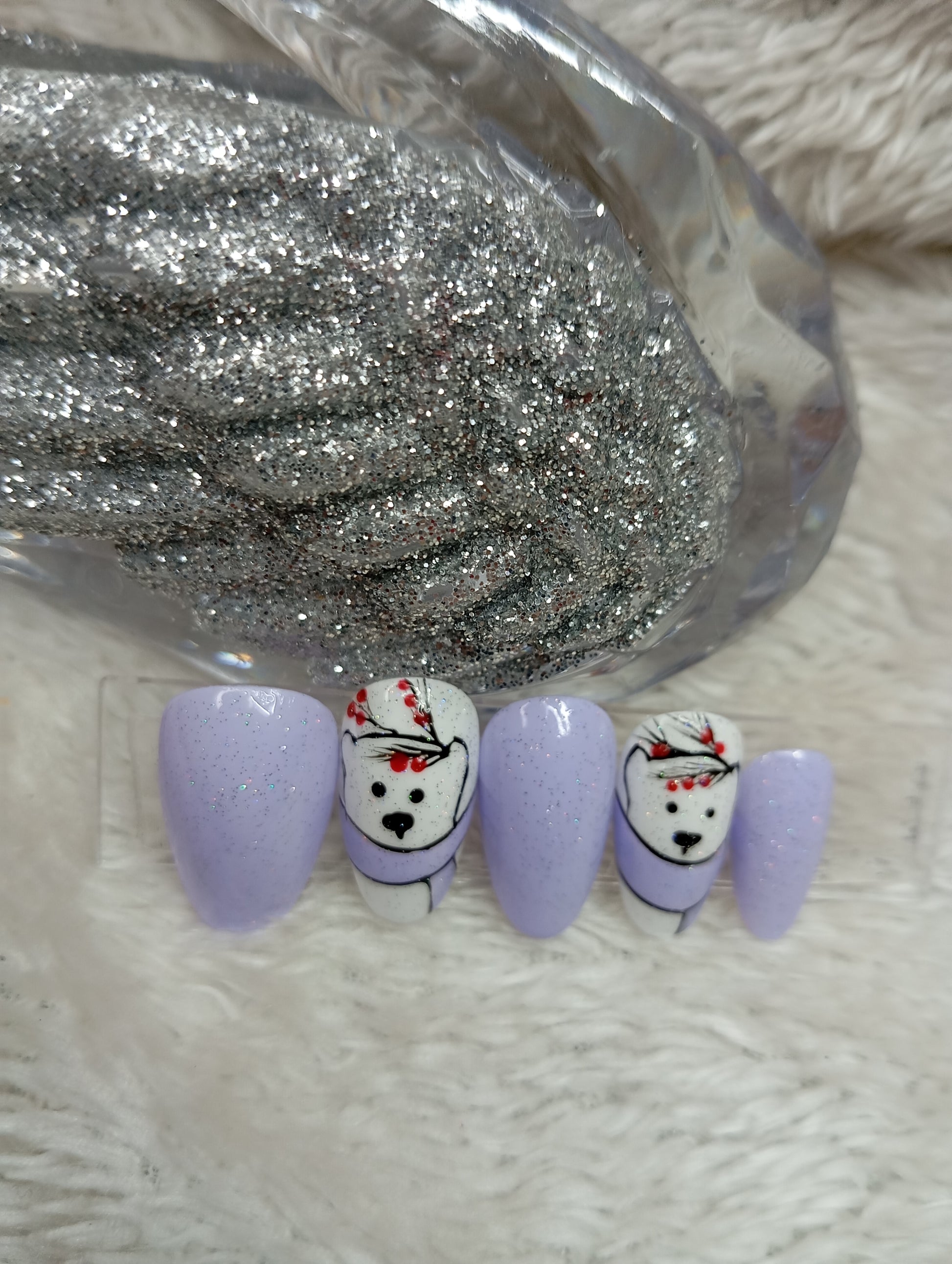 L'esprit des fêtes avec une touche d'originalité ! Un set doux et joyeux, parfait pour les amatrices de nail art de saison. Le fond lilas givré met en valeur le dessin adorable de l'ours polaire.
