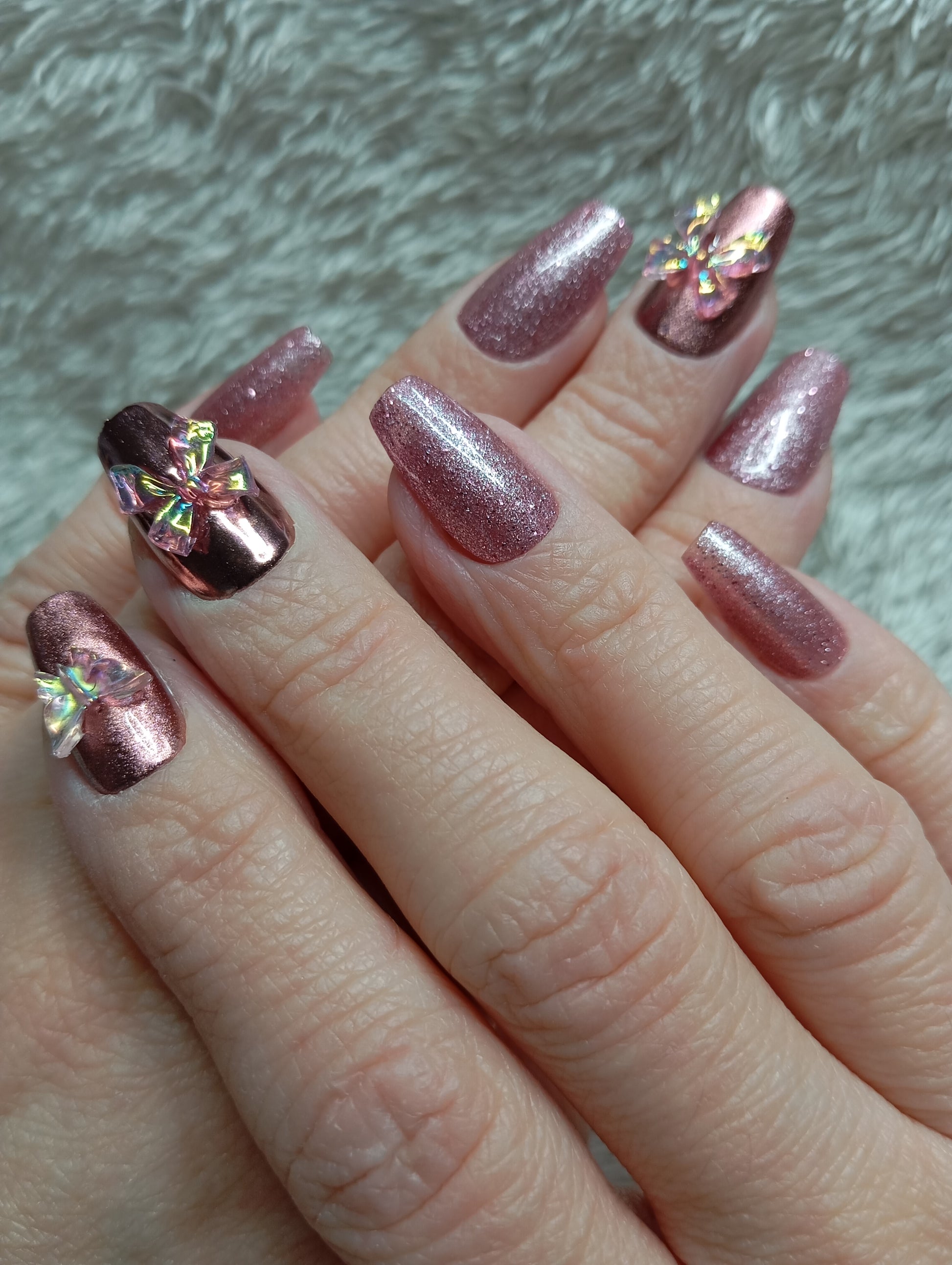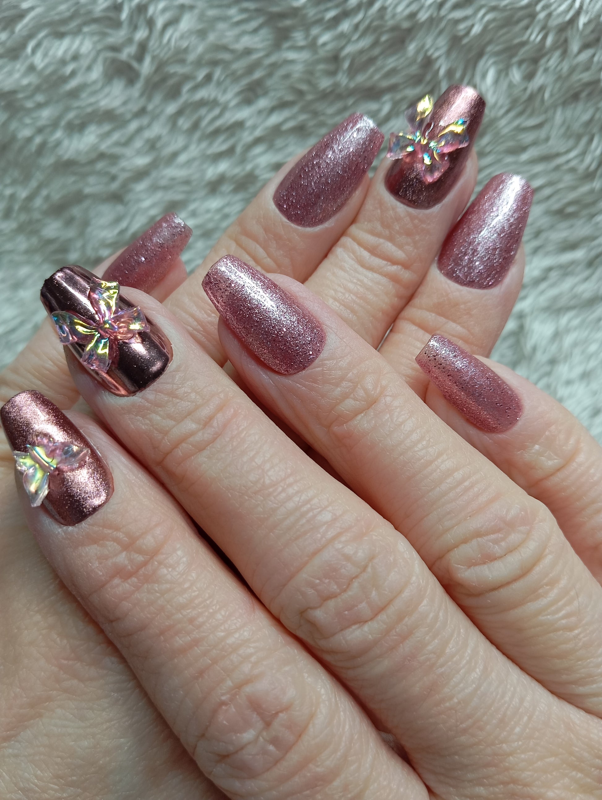 L'élégance des papillons prend vie sur vos ongles ! Des papillons délicats peints à la main sur un fond sophistiqué, sublimés par des touches scintillantes. Un design glamour et poétique qui capture la beauté de la nature 🦋✨