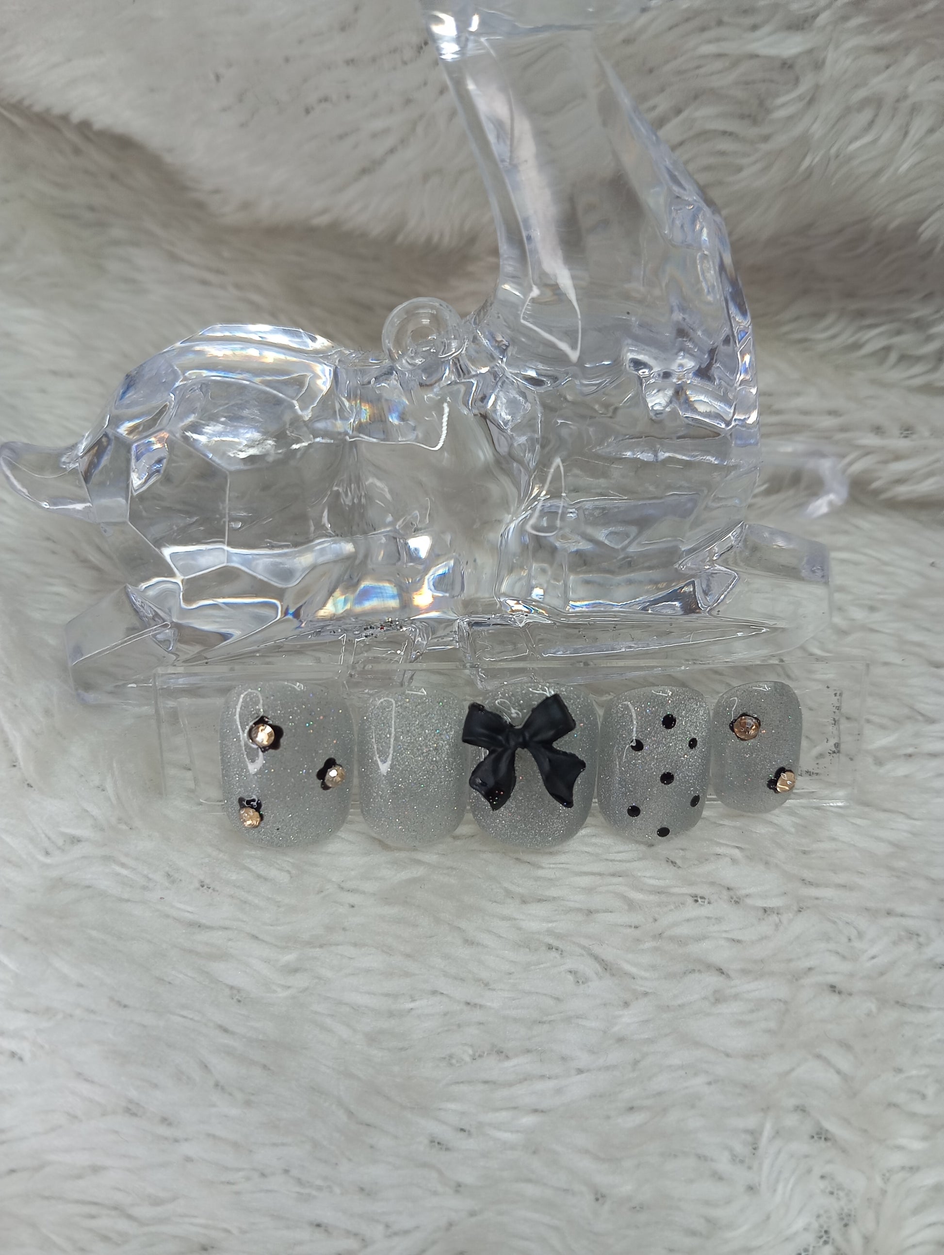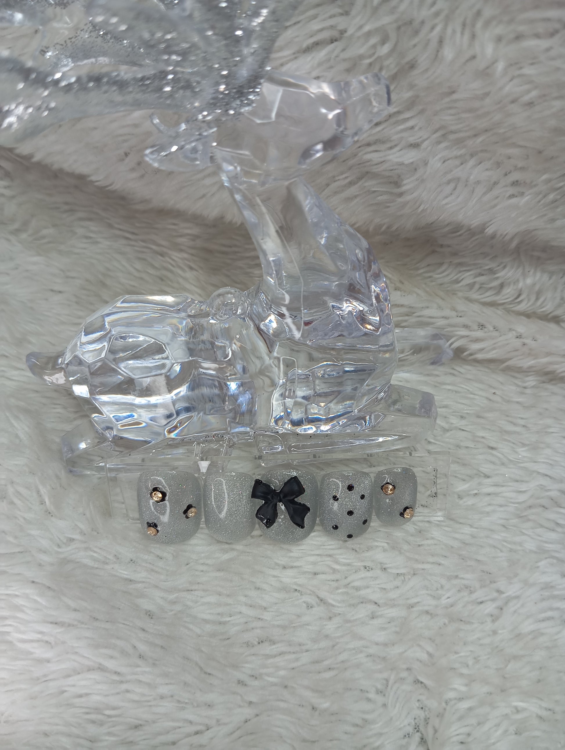 Press-On Nails Carrés "Élégance Grise & Nœud Noir