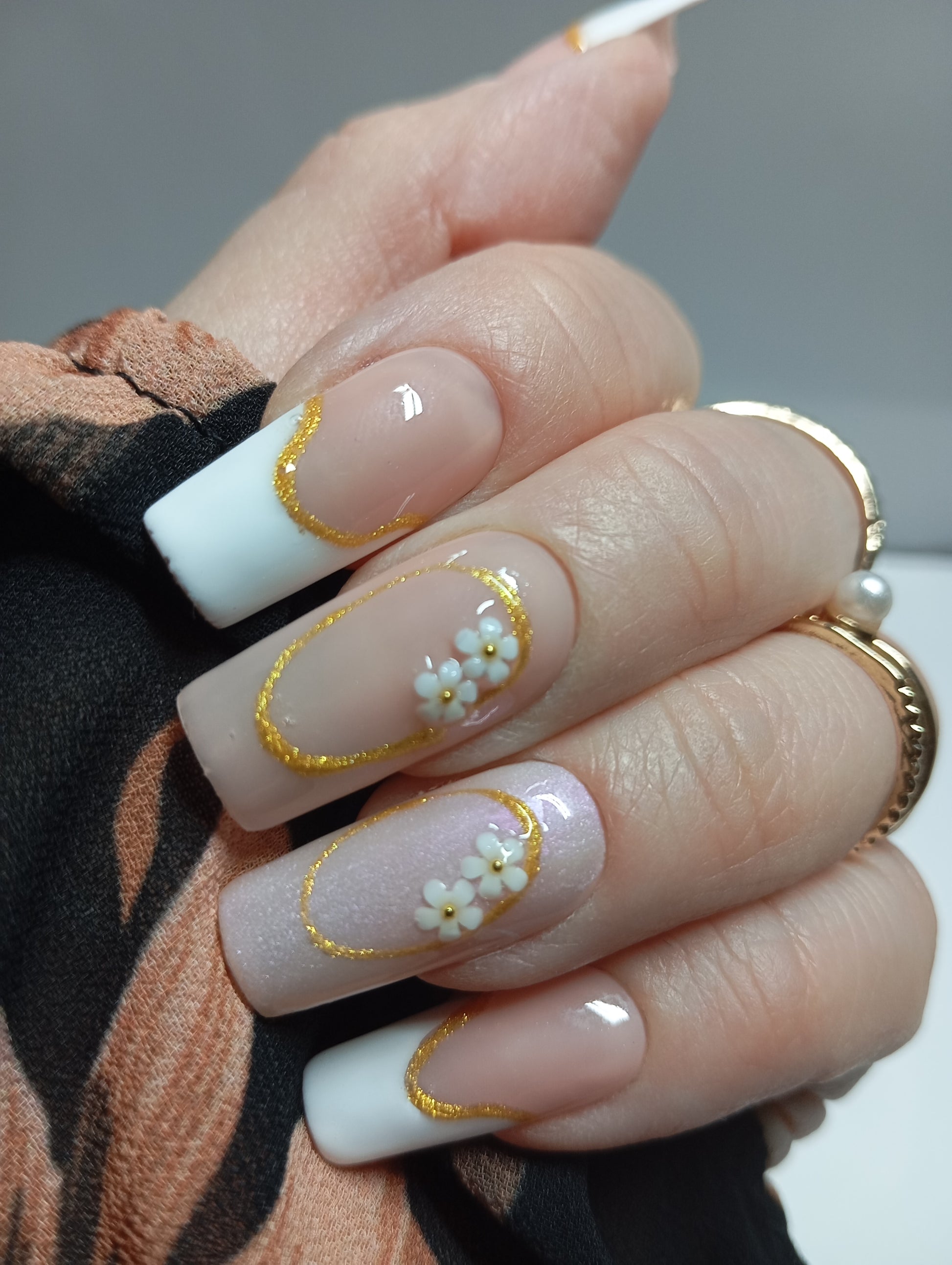 L'élégance à l'état pur. Ce set réinvente la French classique avec un liseré doré scintillant et de délicates fleurs en relief. Idéal pour une mariée, un événement formel ou pour sublimer votre quotidien avec chic. Résultat parfait en 15 minutes.