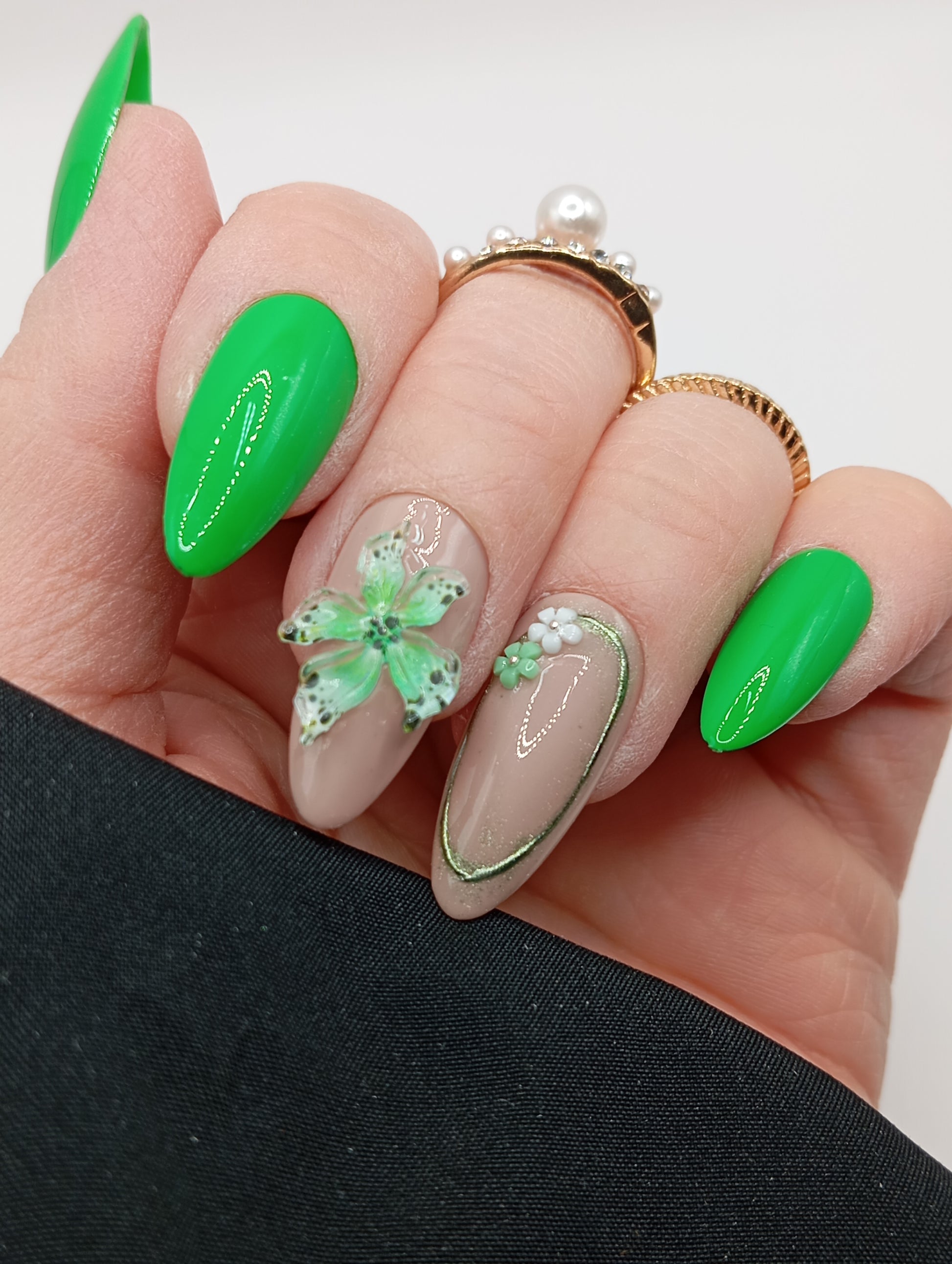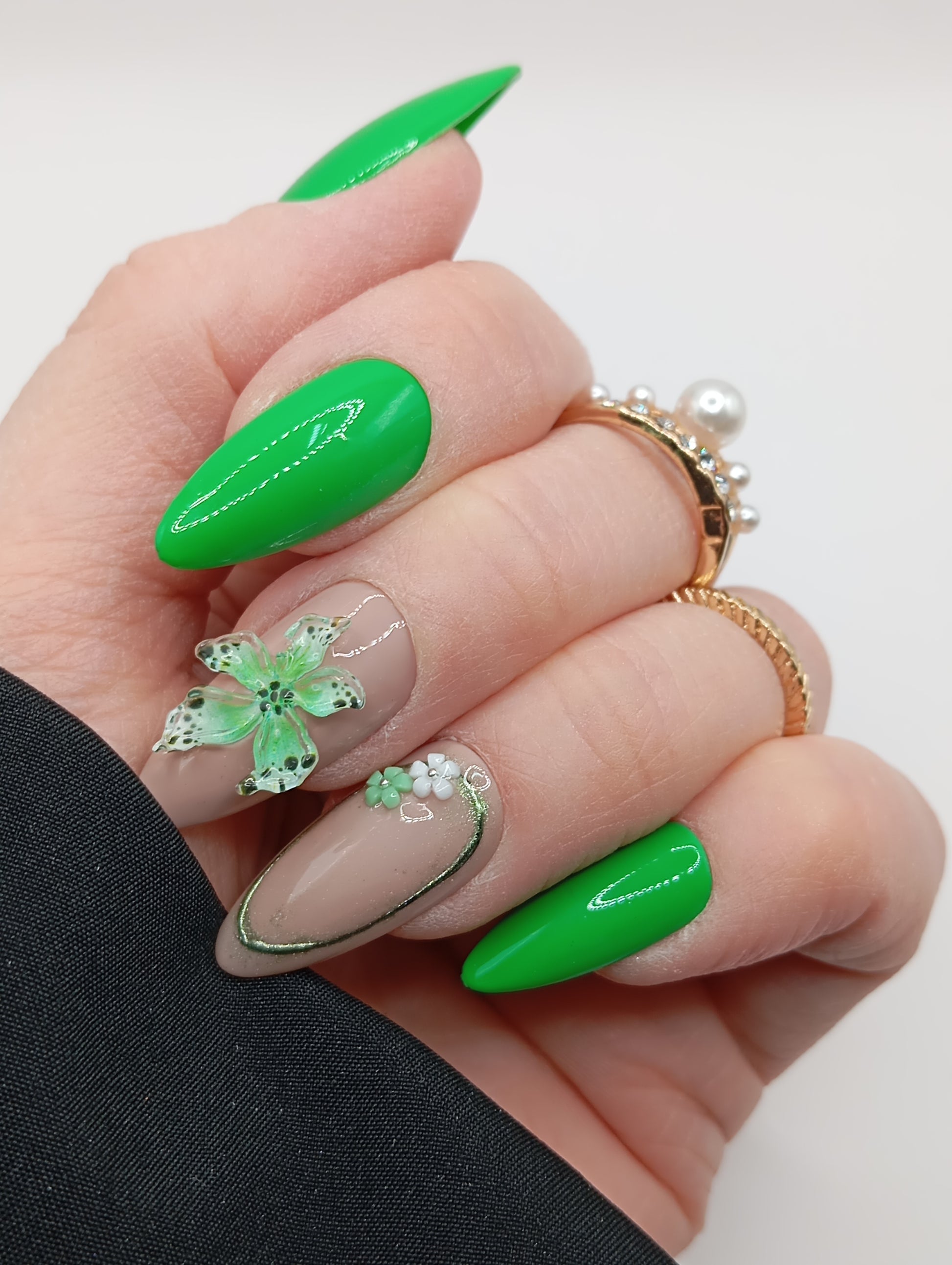 Faites une déclaration de style ! Ce set capte la lumière avec son vert néon éclatant et surprend avec ses fleurs 3D délicates. Idéal pour les festivals, l'été ou pour dynamiser votre tenue. Manucure spectaculaire, réutilisable et réalisée à la main.