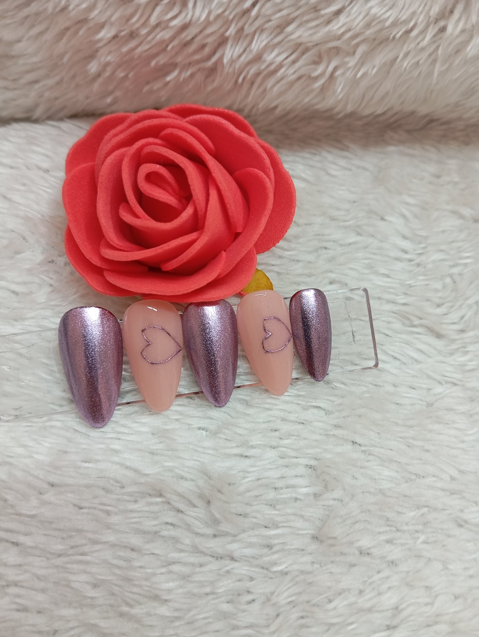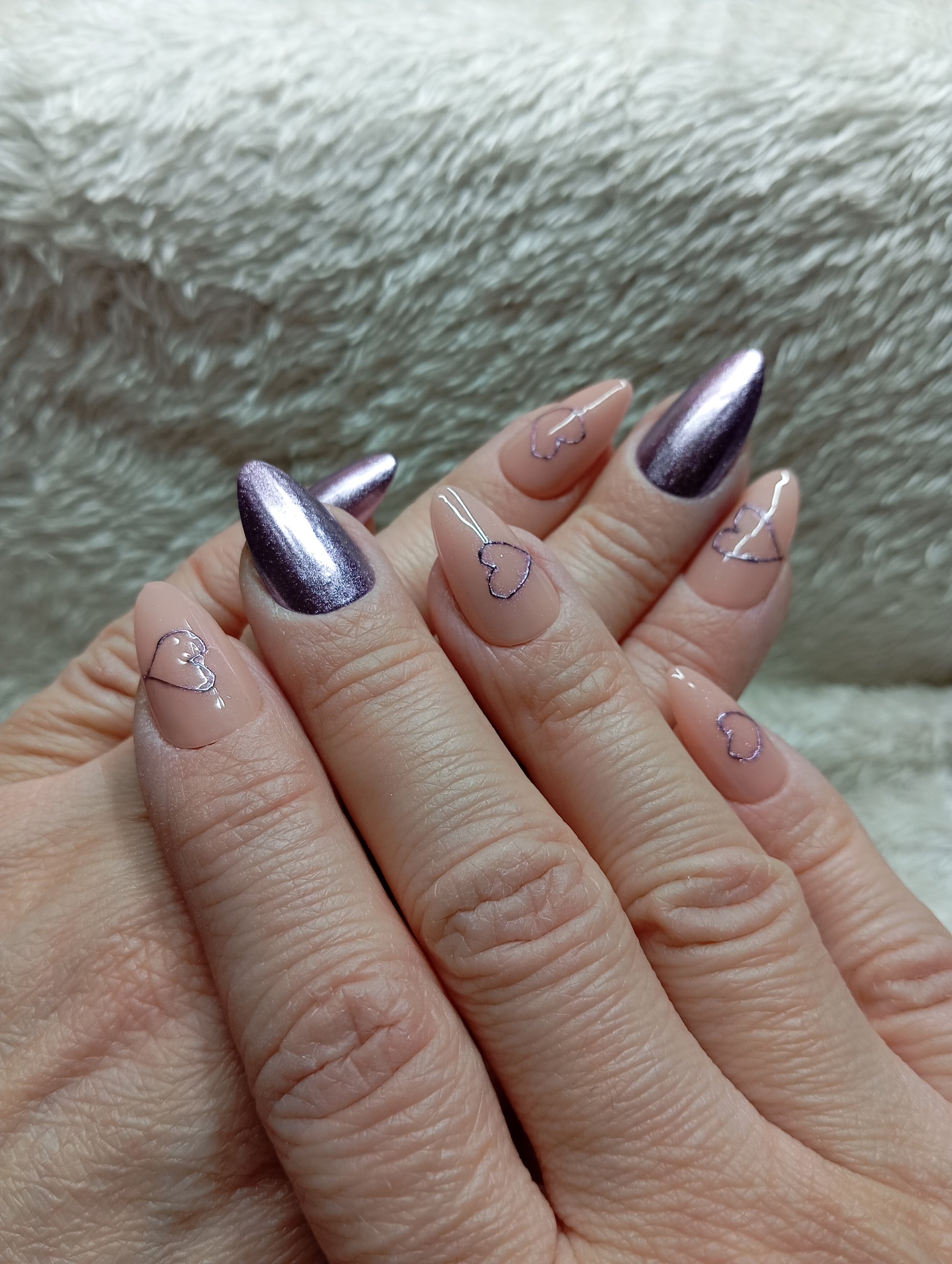 🖌️ Technique : Nude crème + violet métallique scintillant + cœurs tracés main