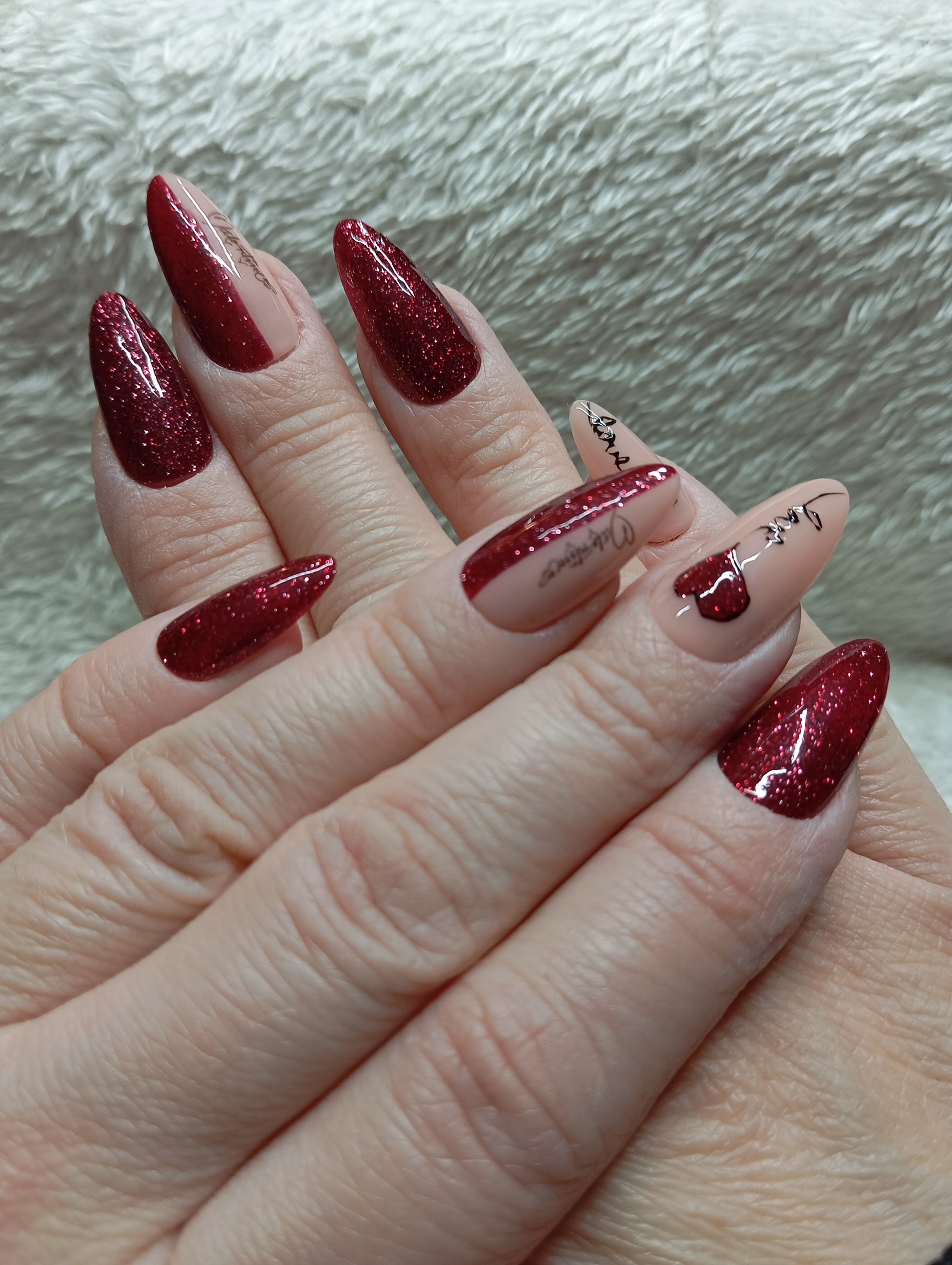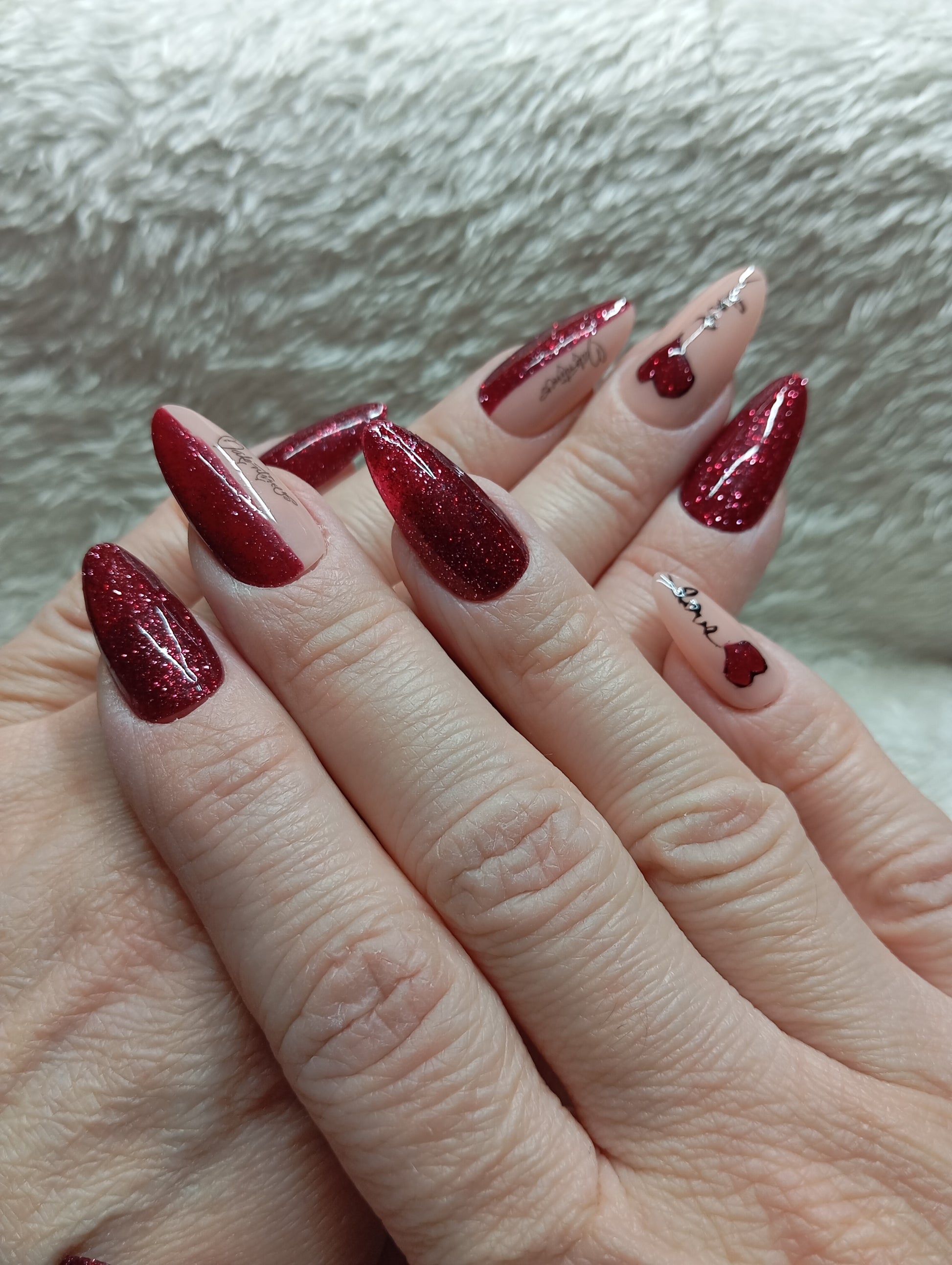 🖌️ Technique : Paillettes rouges intenses + calligraphie main + cœur peint + détails 3D